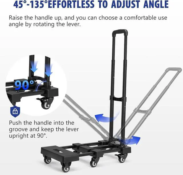 45°-135° Adjustable HandleThe dolly cart with wheels can be free to adjust the handle angle, is 45°to 135°adjustable. And telescoping handle of the folding hand truck has 3 different height arbitrary switching, you can adjust the height according to your need