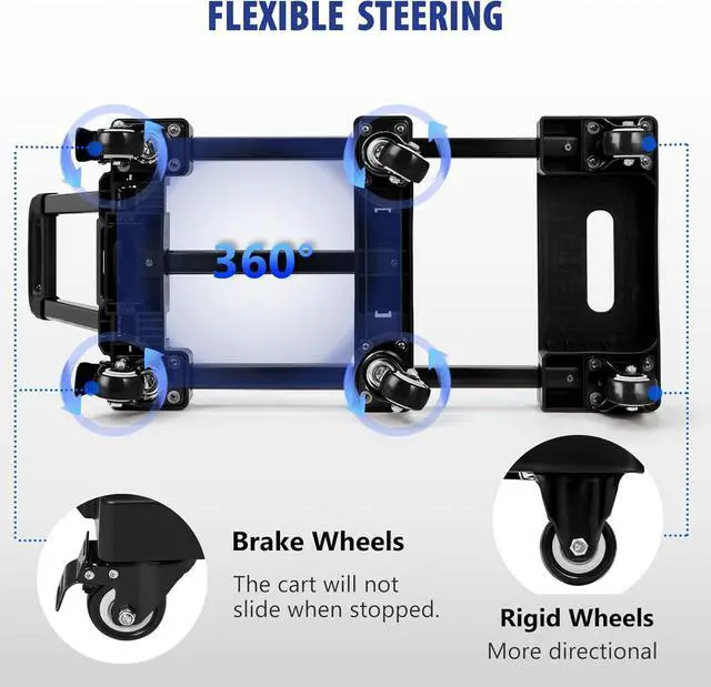 Enhanced 6 Wheels Design with BrakeDolly cart features 4 pcs 360° swivel wheels (includes 2 brake wheels) + 2 pcs rigid wheels, making items more directional and fixed during transportation, you can also secure the stroller on the slope. youll enjoy effortless maneuverability and precise control for all your transporting needs