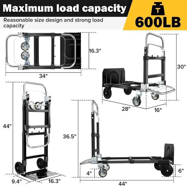 Heavy Duty & Rubber WheelsThis dolly cart heavy duty is made of durable steel frame and can support 600 pounds in four wheel mode and 220 pounds in two wheel mode. It features two 6 inch directional front wheels and two 4 inch rotating rear wheels that comes with brakes, ensure you can flexibly change the direction of the hand truck dolly, move smoothly, and stop safely