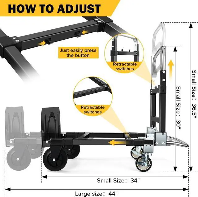 Easy to Switch and UseYou will get a two wheel dolly and a four wheel hand truck all in one! Easily switch between a two wheel upright dolly and a four wheel hand truck in secondsno pins or tools required. The folded size is 34× 16.3 × 3.7, It' s durable and easy to fold so you can take it anywhere. After use you can store in car trunk, under a bed, in a closet, storage rooms easily. It is designed for moving heavy