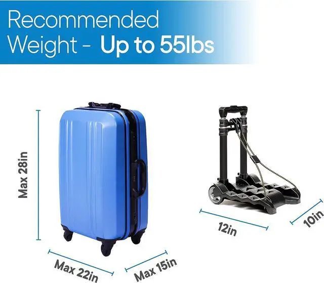 Attention: The RMS Folding Luggage Cart is a convenient & portable tool for your everyday travel, it is NOT intended to use on items with excessive dimensions over 28 Tall, 22 Wide, 12 Deep (Please see Product Image 2 for reference) or heavy items or baggage over 55 LBS. Before you purchase this item, please kindly note the product dimensions and weight capacity to ensure the product fits your everyday needs.