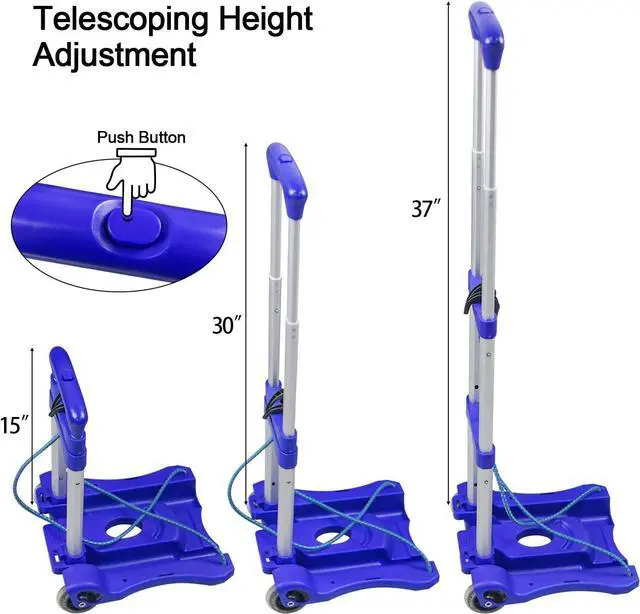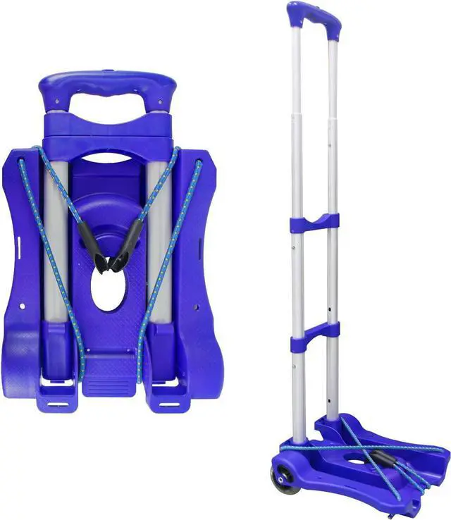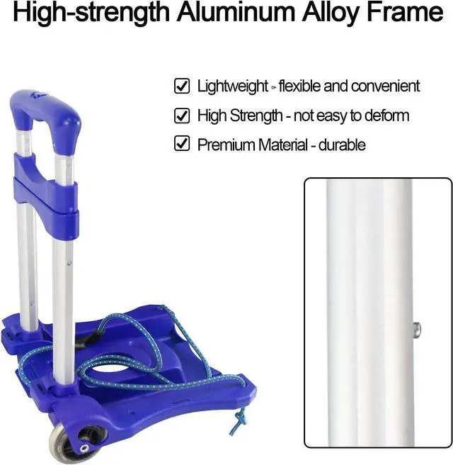 Bright blue color. Lightweight telescopic aluminium travel trolley with 2 hook ropes.