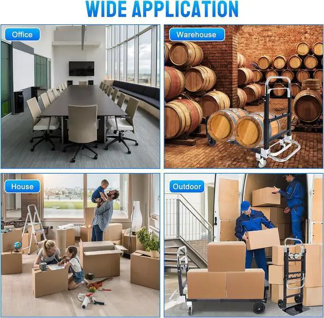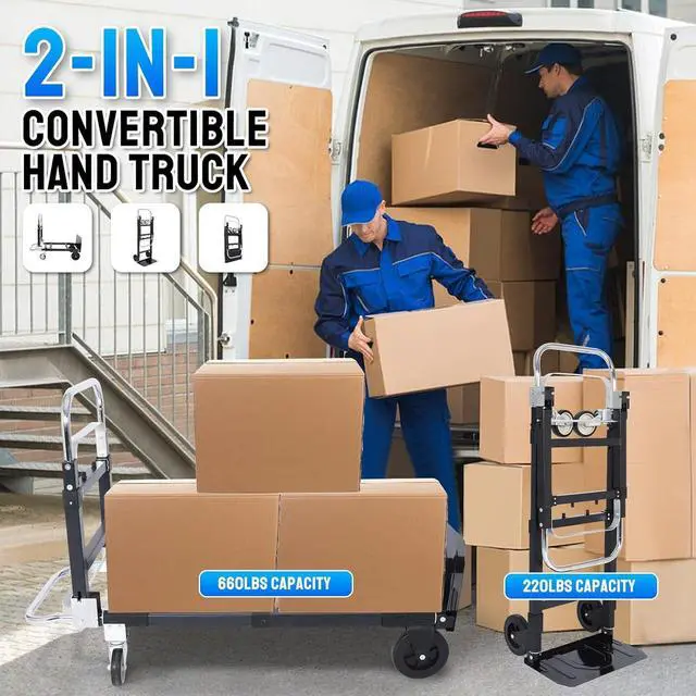 Convertible Design: Our hand truck quickly converts between a two-wheel hand truck and a four-wheel platform cart in seconds, without pins or tools, supporting a 220-pound load on two wheels and 660 pounds on four