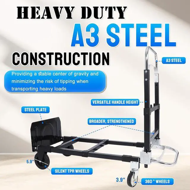 Heavy-Duty Construction: This folding hand truck is built from A3 steel, providing a stable center of gravity and minimizing the risk of tipping when transporting heavy loads. Its steel surface is easy to clean with water or a wipe and remains resistant to deformation in extreme temperatures