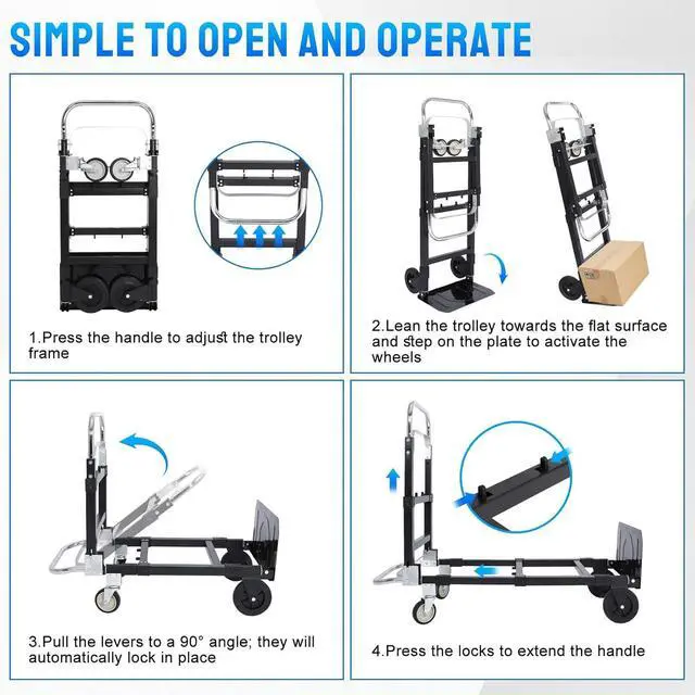 Easy to Use: For the first time to use the truck, it is better to watch the video. For truck mode, just press the button to raise the handle, step on the plate, and the wheels will automatically openthen youre ready to go. For cart mode, pull the handle to a 90° angle, and it will lock into place automatically. Press the buttons to adjust the length as needed.