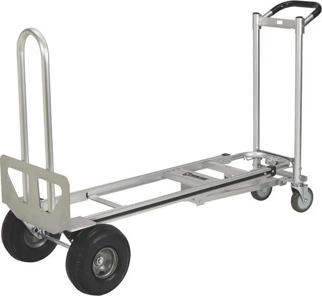 Durable aluminum construction 550-lb. capacity in hand truck mode 770-lb. capacity in platform truck mode 10in. fully pneumatic wheels and swivel casters Includes plate extender to ease the handling of large loads