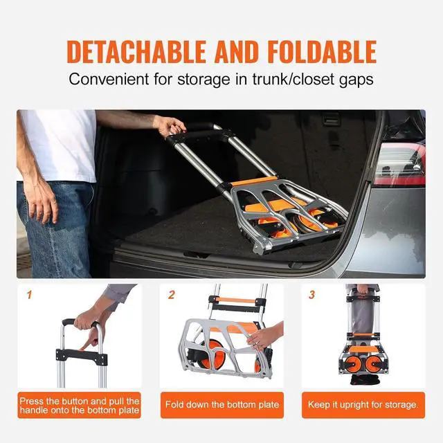 Portable and Space-Saving: Need a convertible hand truck that' s easy to carry and store? Look no further! Our foldable design allows you to pack it away in a snap. Whether it' s in your car trunk, under your bed, or tucked away in a closet, this compact hand truck is always ready for action.