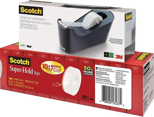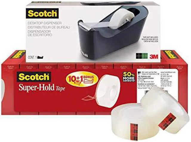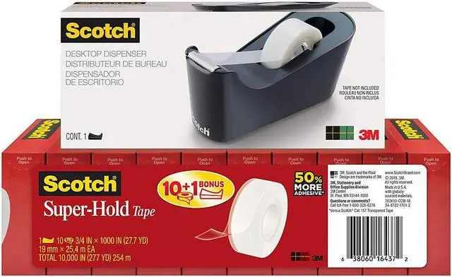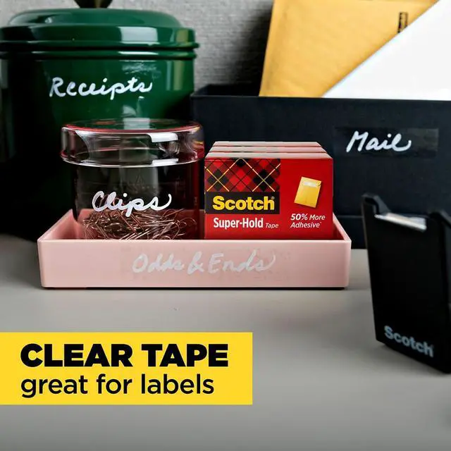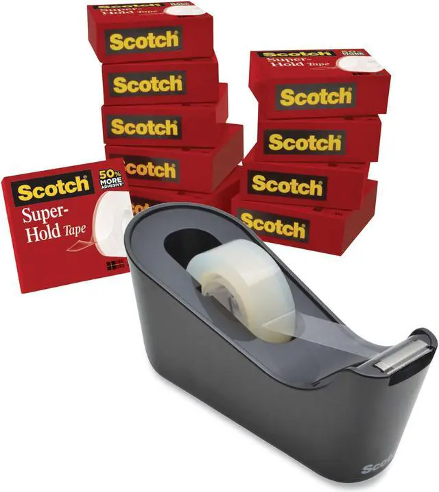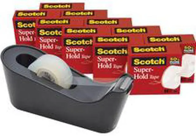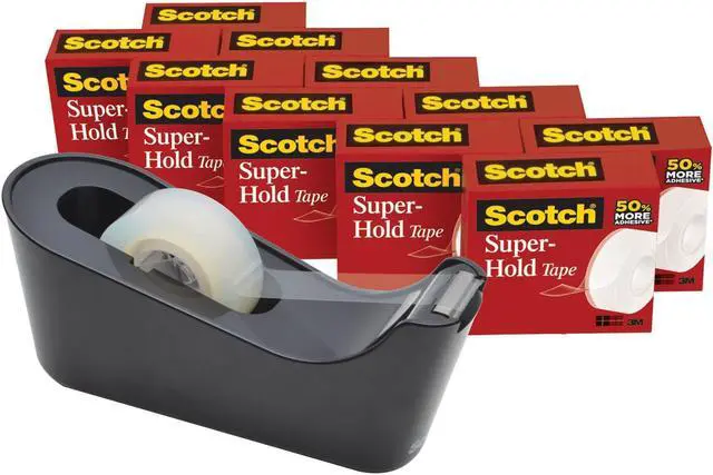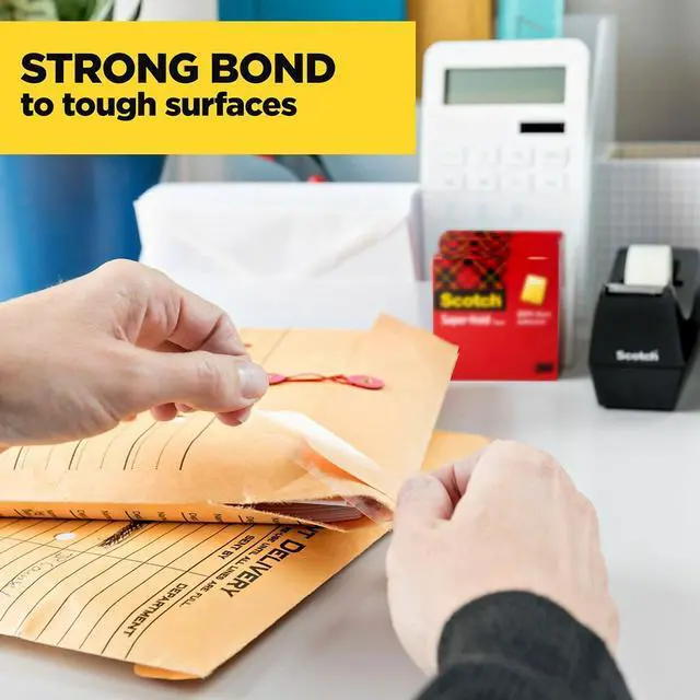 From sealing envelopes to making repairs on the fly, rely on the powerful, moisture-resistant bond of Scotch Super-Hold Tape. It delivers a stronger bond than Scotch's standard transparent tape for your most important jobs. It's strong and durable with 50 percent more adhesive so your items will hold securely. The thicker backing offers durability when a secure, lasting hold is essential. Virtually crystal-clear, this tape holds strong without standing out - perfect for repairs, mounting, crafts and more. Tape is easy to apply with no mess. Included desktop dispenser fits comfortably in your hand and lets your easily unroll and cut to your desired amount. Photo-safe tape is compatible with permanent markers for convenient labeling.