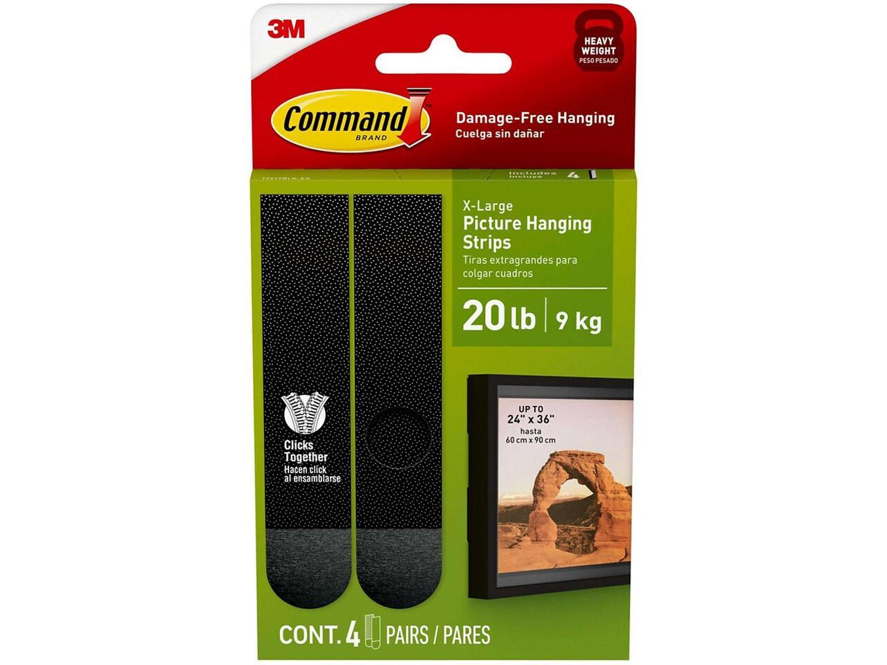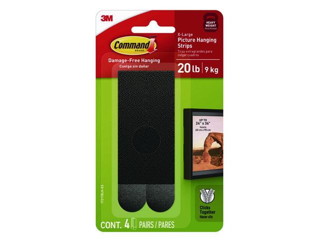 - INCLUDES - 4 Pairs of X-Large, Black Command Heavyweight Picture Hanging Strips (8 Strips total); 4 XL strips holds 20 lbs. Max frame size 24 in. x 36 in. REMOVES CLEANLY- Redecorate when inspiration strikes. These strong picture hangers leave no sticky adhesive behind. Perfect for your dorm, apartment, home, and office.