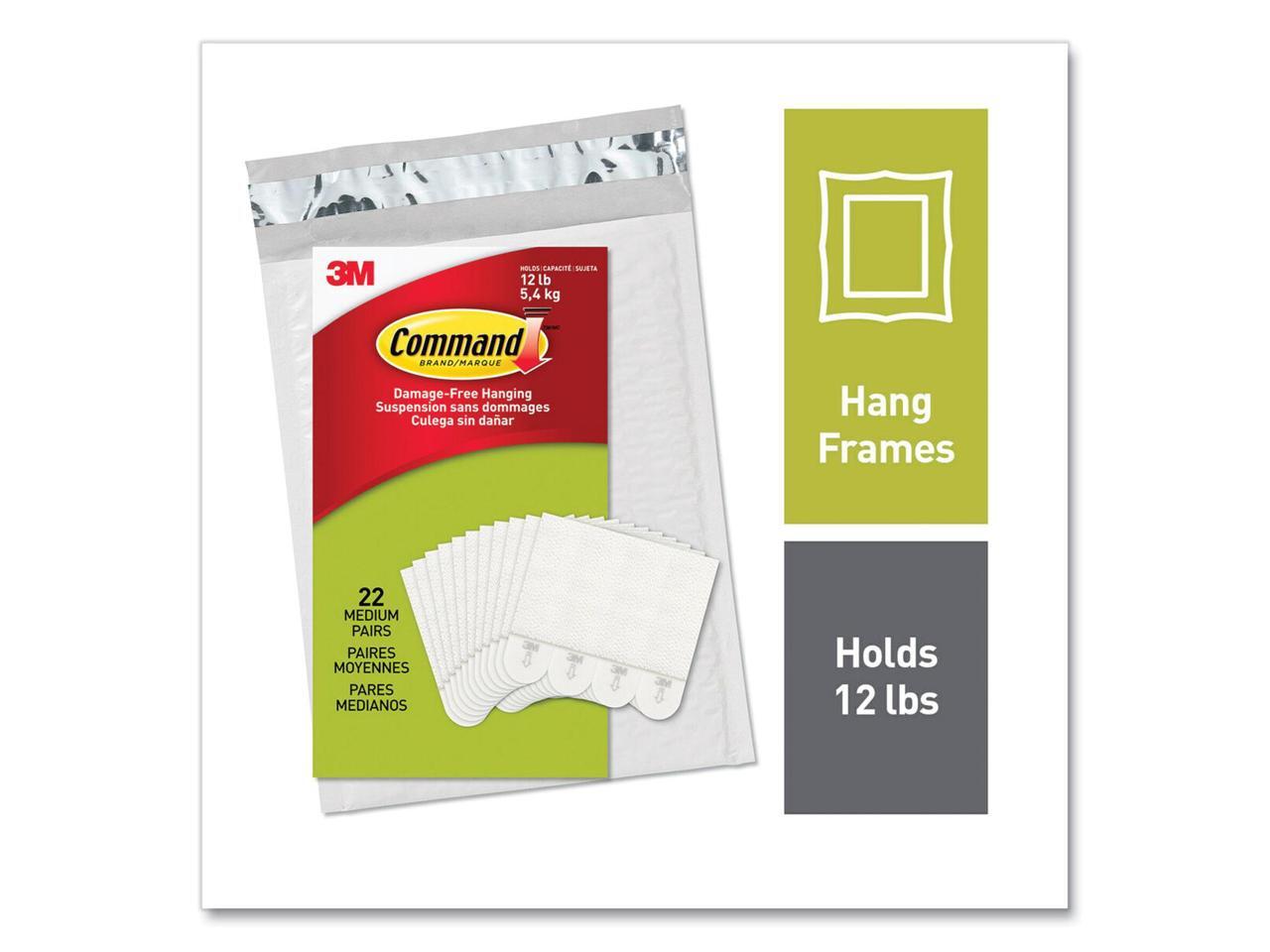 - INCLUDES- 22 Pairs of Medium, White Command Picture Hanging Strips (44 Strips total); 4 Pairs hold 12 lbs. Maximum frame size of 18 inches x 24 inches. REMOVES CLEANLY- Redecorate when inspiration strikes. These picture hangers leave no sticky adhesive behind. Perfect for your dorm, apartment, home, and office.