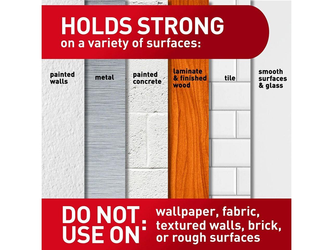 - STRONG AND VERSATILE-Command Picture Hanging Strips hold strongly on a variety of surfaces including painted walls, metal, painted concrete, laminate finished wood (painted or varnished: shiplap, cabinets, or doors), tile, glass and other smooth surfaces.