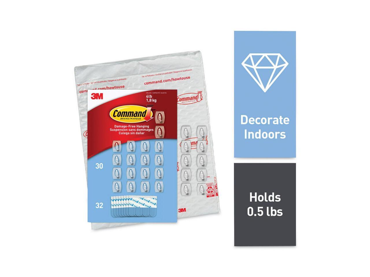 - INCLUDES 30 clear hooks, 32 small strips; 1 hook holds 0.5 lbs. REMOVES CLEANLY- Reorganize when inspiration strikes; These wall hooks leave no sticky adhesive behind; Perfect to use inside cabinets and closets, in your college dorm, apartment, home, and office.