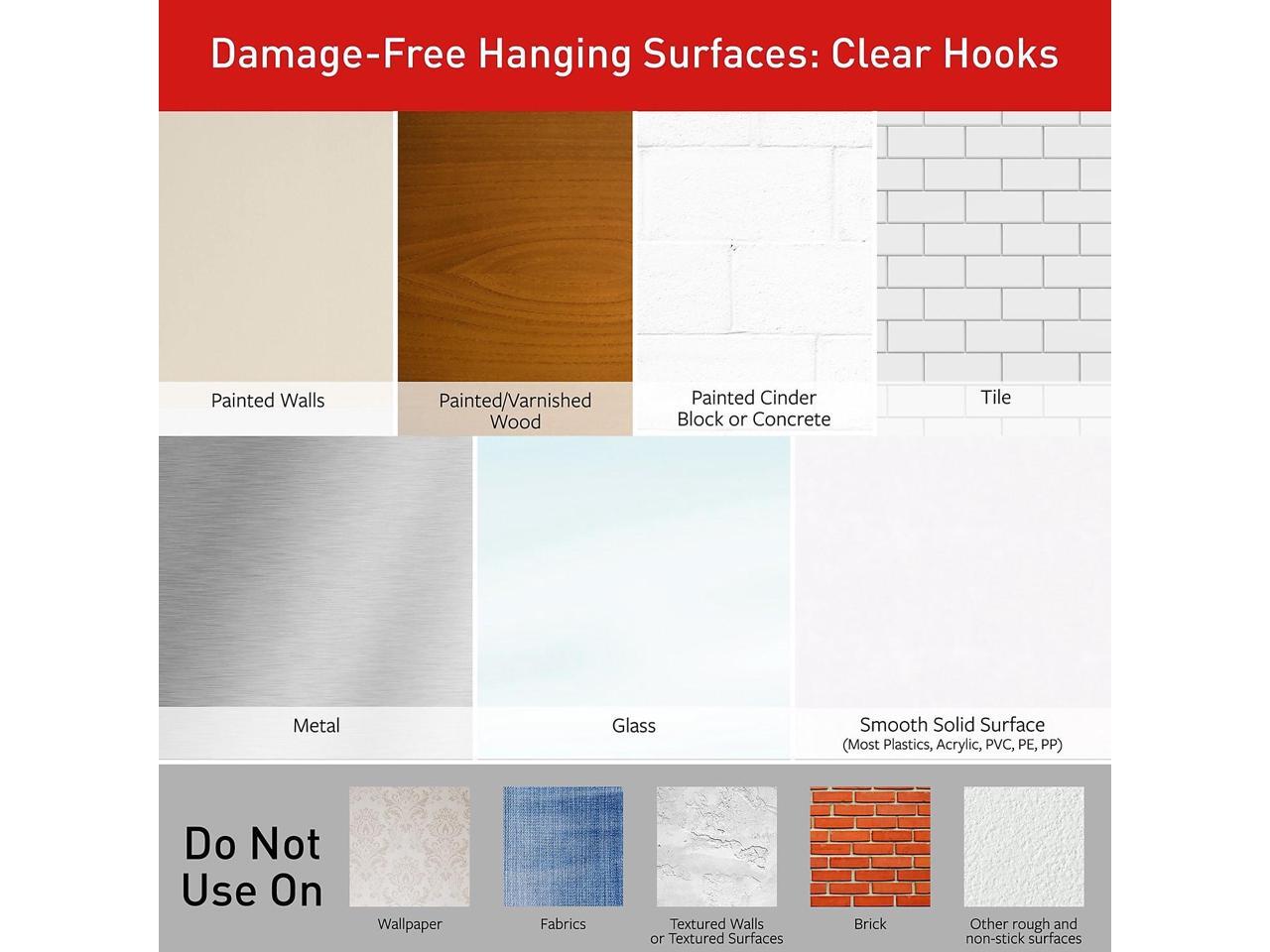 - STRONG AND VERSATILE- Command Clear Hooks hold strongly on a variety of smooth indoor surfaces including painted walls, smooth ceilings, finished wood, glass, tile, and metal. Not recommended to place on or near windows.