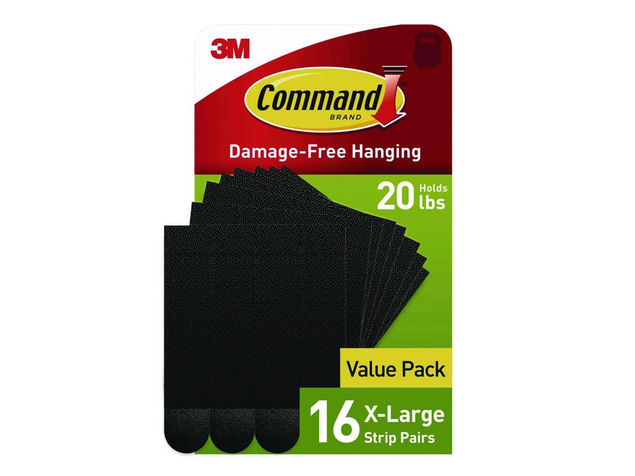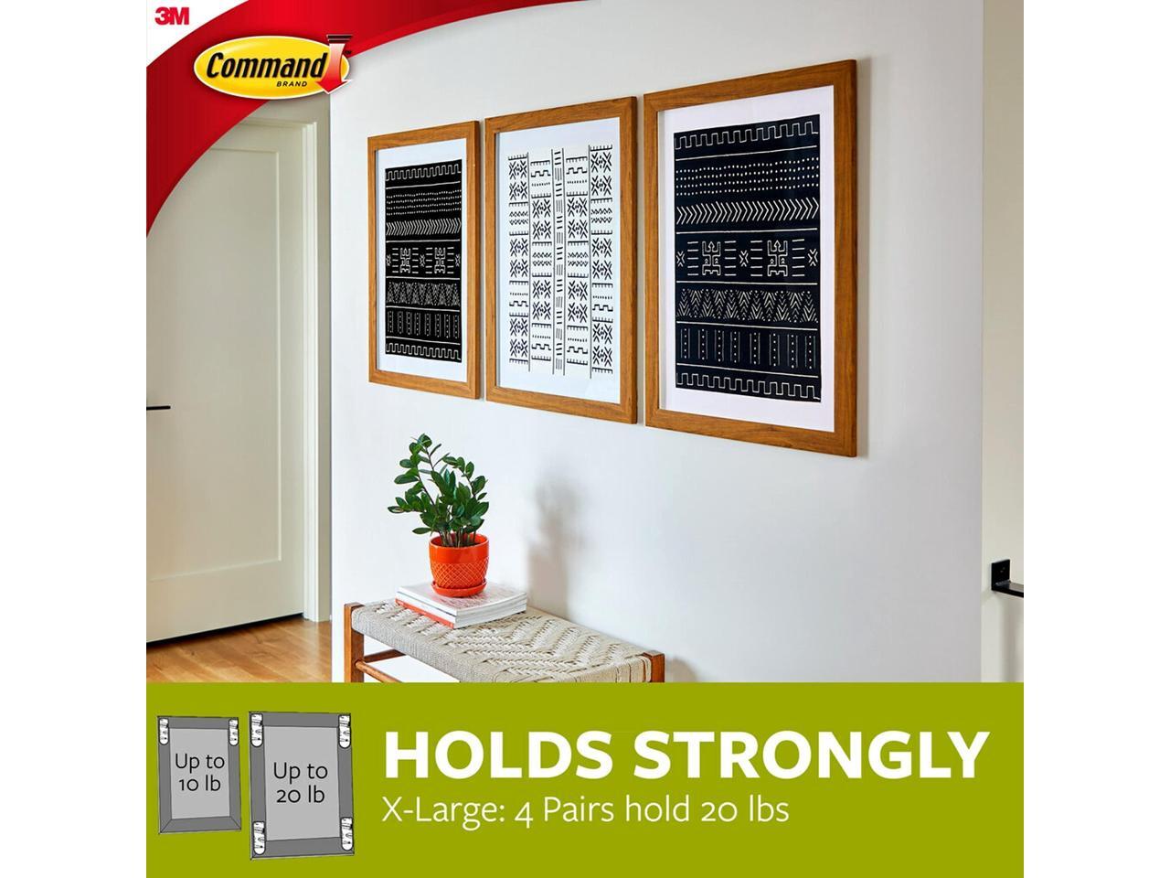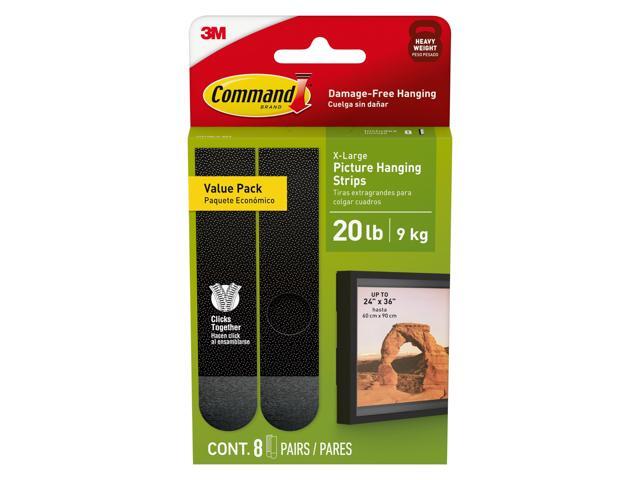 - INCLUDES - 16 Pairs of X-Large, Black Command Heavyweight Picture Hanging Strips (32 Strips total); 4 XL strips holds 20 lbs. Max frame size 24 in. x 36 in. REMOVES CLEANLY- Redecorate when inspiration strikes. These strong picture hangers leave no sticky adhesive behind. Perfect for your dorm, apartment, home, and office.