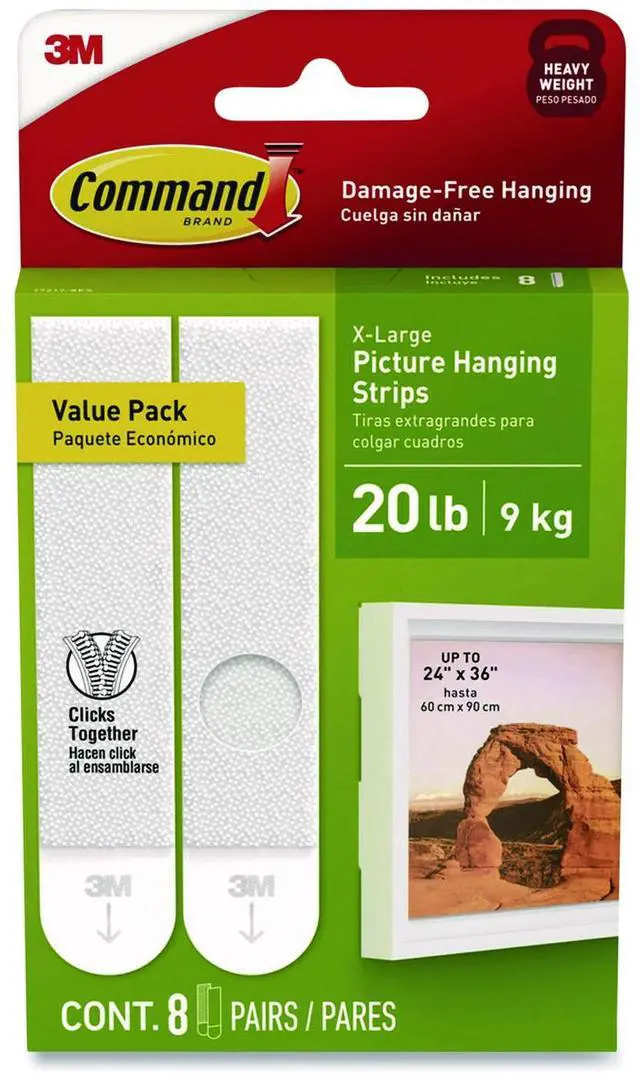 - INCLUDES - 8 Pairs of X-Large, White Command Heavyweight Picture Hanging Strips (16 Strips total); 4 XL strips holds 20 lbs. Max frame size 24 in. x 36 in.