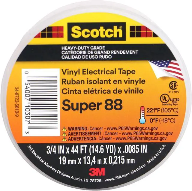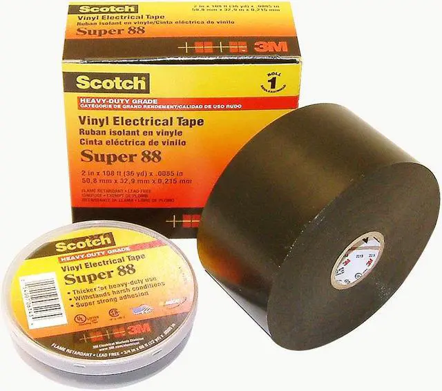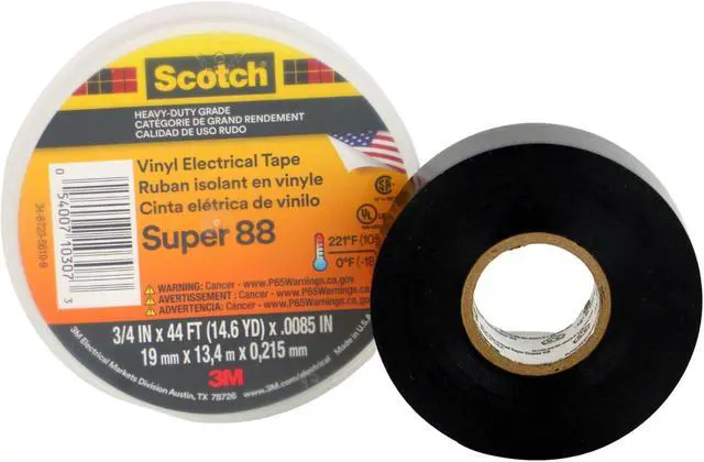 Scotch Super 88 Heavy-Duty Grade Electrical Tape is a premium professional-grade, 8.5-mil thick, all-weather vinyl insulating tape. It is designed to perform continuously in ambient temperatures up to 105C (220F). The tape is conformable for cold weather applications down to -18°C (0°F). It has excellent resistance to abrasion, moisture, alkalies, acids, corrosion, and varying weather conditions. The combination of elastic backing and aggressive adhesive provides moisture-tight electrical and mechanical protection with minimum bulk. Scotch® Tape Super 88 is an Underwriters' Laboratories Listed and Canadian Standards Association "Insulating Tape." The tape is compatible with solid dielectric cable insulations and with rubber and synthetic splicing compounds, as well as epoxy and polyurethane resins. It inhibits corrosion of electrical conductors and can be used for indoor and outdoor applications. A brand of 3M. Country of Origin: United States.