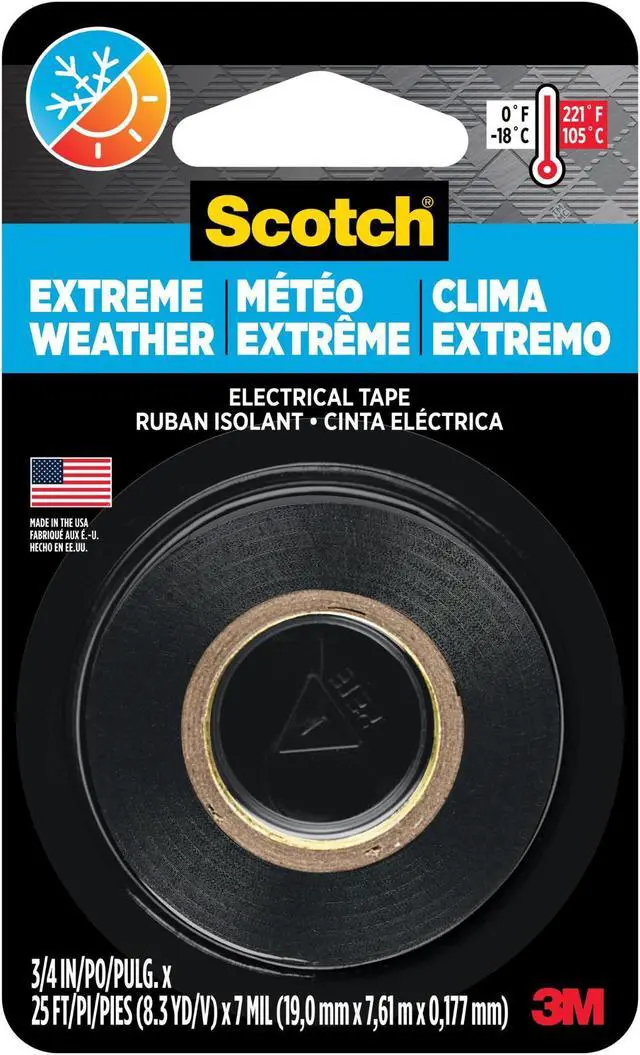 Scotch Extreme Weather Electrical Tape offers the highest quality available. Long lasting with superior adhesion and handling in a wide range of temperatures and conditions. Scotch Extreme Weather Electrical Tape is made of premium grade all weather vinyl electrical insulating tape. It maintains a conformability for cold weather applications down to 0°F (18°C). Country of Origin: United States.