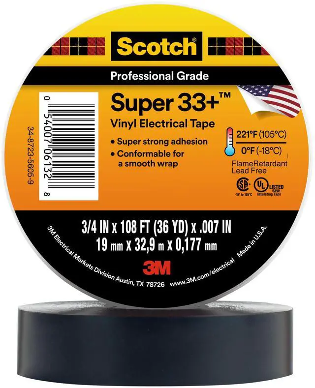 Scotch Super 33+ Vinyl Electrical Tape is a black, 7 mil premium grade all-weather vinyl electrical insulating tape with an aggressive adhesive and elastic backing that enables it to easily conform to irregular surfaces for water-resistant electrical and mechanical protection. Scotch Super 33+ provides flexibility and easy handling for all-around performance. Its PVC backing with its excellent electrical insulating properties provides primary electrical insulation for splices up to 600V and protective jacketing. UL Listed and CSA Approved. Excellent resistance to UV rays, abrasion, moisture, copper corrosion, alkalis and acids, and it is flame-retardant. Excellent all-weather performance in cold to 0 degrees and it is designed to perform in a continuous temperature environment up to 220 degrees F. A brand of 3M. Country of Origin: United States.