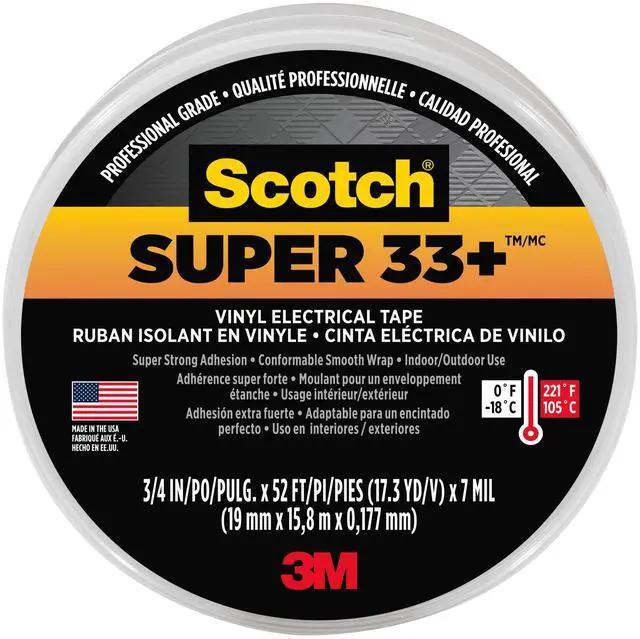 Scotch Super 33+ Vinyl Electrical Tape is a black, 7 mil premium grade all-weather vinyl electrical insulating tape with an aggressive adhesive and elastic backing that enables it to easily conform to irregular surfaces for water-resistant electrical and mechanical protection. Scotch Super 33+ provides flexibility and easy handling for all-around performance. Its PVC backing with its excellent electrical insulating properties provides primary electrical insulation for splices up to 600V and protective jacketing. UL Listed and CSA Approved. Excellent resistance to UV rays, abrasion, moisture, copper corrosion, alkalis and acids, and it is flame-retardant. Excellent all-weather performance in cold to 0 degrees and it is designed to perform in a continuous temperature environment up to 220 degrees F. A brand of 3M. Country of Origin: United States.