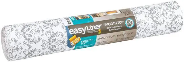 Duck Brand EasyLiner Smooth Top Shelf Liner provides an easy to clean surface for cabinets in your kitchen, bath and laundry room. The non-adhesive grip bottom keeps the shelf liner in place and does not leave a sticky residue while the smooth top allows you to easily slide objects across. The smooth top (it does not contain holes like EasyLiner Select Grip) keeps spills and crumbs contained. It is easy to cut, install, replace or reposition. Duck Brand EasyLiner Smooth Top Shelf Liner is machine washable for easy cleanup. Country of Origin: United States.