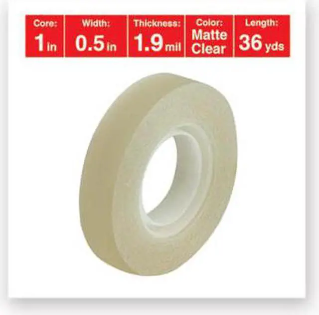 Be as subtle or as obvious as you wish to be. Matte finish tape disappears on contact, but it also accepts ink and pencil marks. Whether you want your repairs to be invisible or your labeling notes to be noticed, this is the right tape for the job. Enhanced adhesive holds tight to most dry, nonporous surfaces. Resilient backing is ideal for repairing damaged documents and sealing correspondence. Standard-core rolls fit most desktop-tape dispensers. Value PackStock up and save! Core Size: 1"; Dispenser Included: No; Adhesive Material: Acrylic; Backing Material: Plastic.