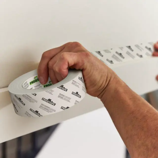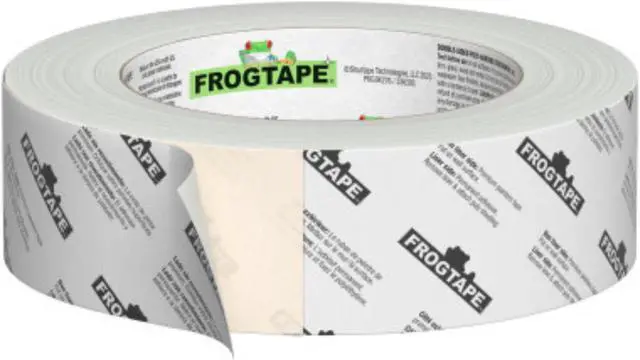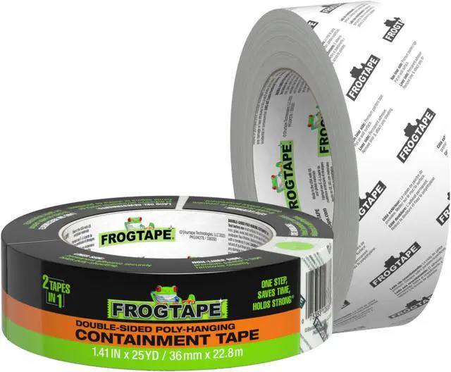 FrogTape Double-Sided Poly-Hanging Containment Tape is a one-step solution for hanging poly sheeting that offers 50% time savings compared to standard methods. With a premium grade painter's tape adhesive on one side and an aggressive adhesive on the other, this all-in-one, high performance containment tape securely holds poly sheeting and ensures protection of surfaces, helping to tackle jobs with speed and ease. Country of Origin: United States.