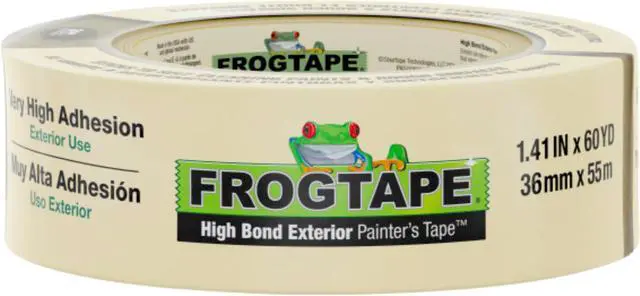 FrogTape High Bond Exterior Painter's Tape is the only painters tape engineered to consistently adhere to hard-to-stick to self-cleaning paint technology, saving you time and frustration on the job. This production-grade, professional masking tape offers very high adhesion for smooth and rough outdoor applications. Plus, the conformable crepe paper backing makes it easy to mask around outdoor surfaces like doorways and windows. This product does not contain PaintBlock Technology since typical applications do not require super sharp paint lines. Country of Origin: United States.