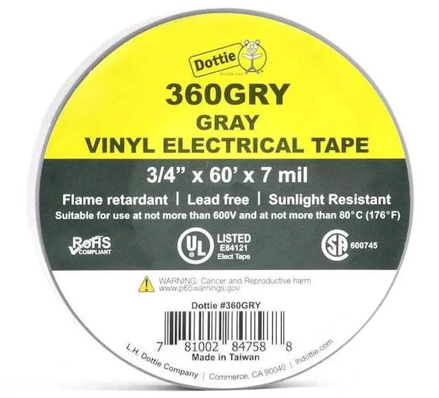 California Proposition 65: This product contains a chemical known to the State of California to cause birth defects or other reproductive harm. DOTTIE 360GRY L. H. Dottie 3/4'' x 60' Gray Electrical Tape, 10PK
