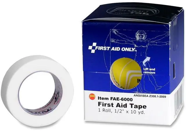 Secure dressings and bandages with this first aid tape that is durable yet tears easily without shredding. Tape adhesive is hypoallergenic, reducing the chances of skin irritation. The 10 yard roll provides reliable holding on skin with gentle removal. This item meets ANSI/ISEA Z308.1-2009 standards.