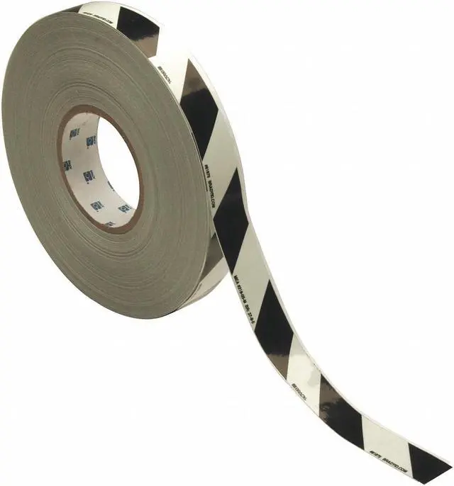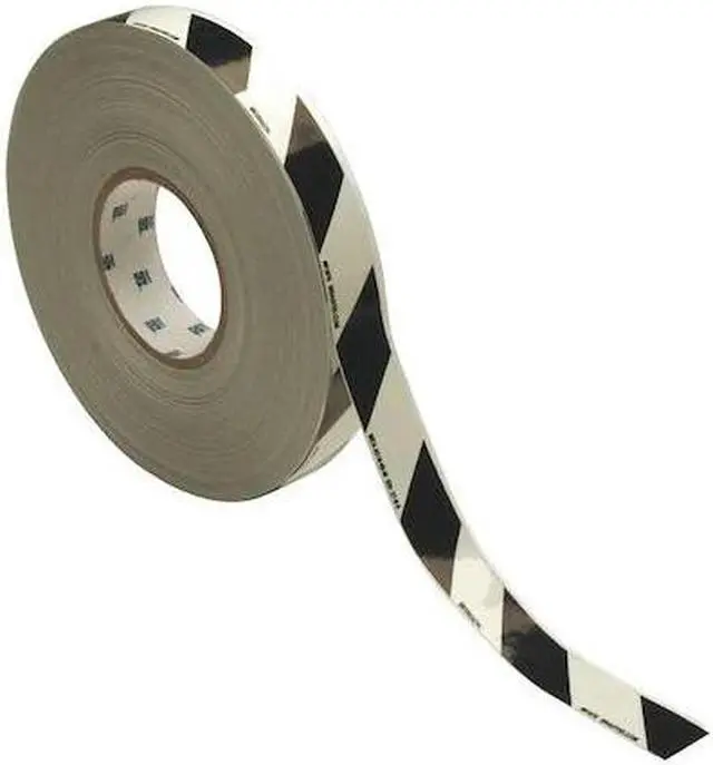 Floor Marking Tape, Continuous Roll, Striped, Black/White, 1 in, 50 ft, 9.4 mil, Polyester, Brady (R), BradyGlo (TM), Series B-523, Legend No Legend, Glow In The Dark Yes, Retroreflective Grade Non-reflective, Tape Finish Gloss