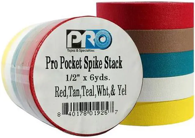 Pro Pocket Spike Stack Bright is five rolls of 1/2†wide x 6 yards long matte cloth tape. The 5 colors are Red, Tan, Teal, White and Yellow. Benefits: High strength, high performance adhesive system. Highly conformable to irregular surfaces. Weather resistant. High thread count. Abrasion resistant. Hand Tearable. Smooth, controlled unwind. Convenient packaging with UPC Barcode.