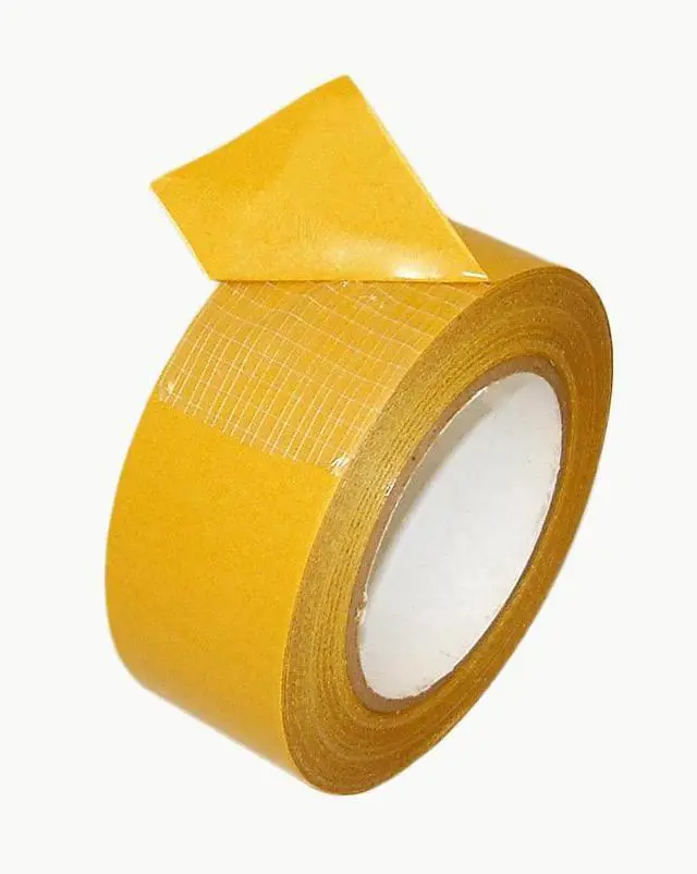 JVCC DC-SCRIM-9 Double-Sided Scrim Tape is a thick polyester (PES/PVA) scrim tape coated on both sides (AKA double-coated) with an aggressive, modified solvent-free water-based acrylic adhesive. The adhesive system is extremely aggressive, and will bond well to nearly all materials; even to difficult surfaces like foam, fabrics, PE and PP films. This double-sided tape is used for permanent bonding of plastic, metal, and wood (P.M.W.) surfaces and is primarily designed for use in bonding carpet and plastic baseboard molding to walls, ceilings, and modular units. It has a good temperature, UV, aging, and water vapor resistance. APEO/APE Free. The tape comes on a gold 90 gr. siliconized paper release liner. Country of Origin: Germany.