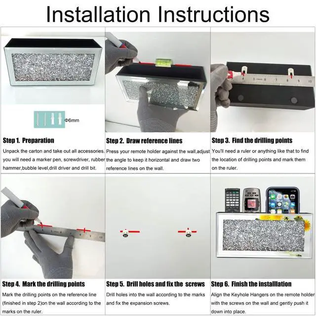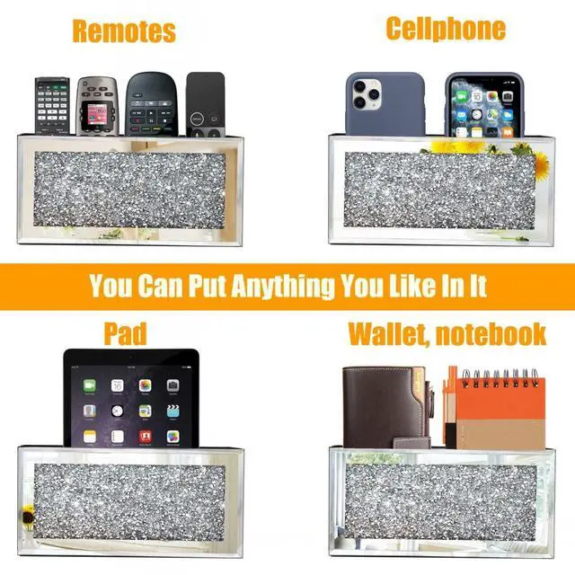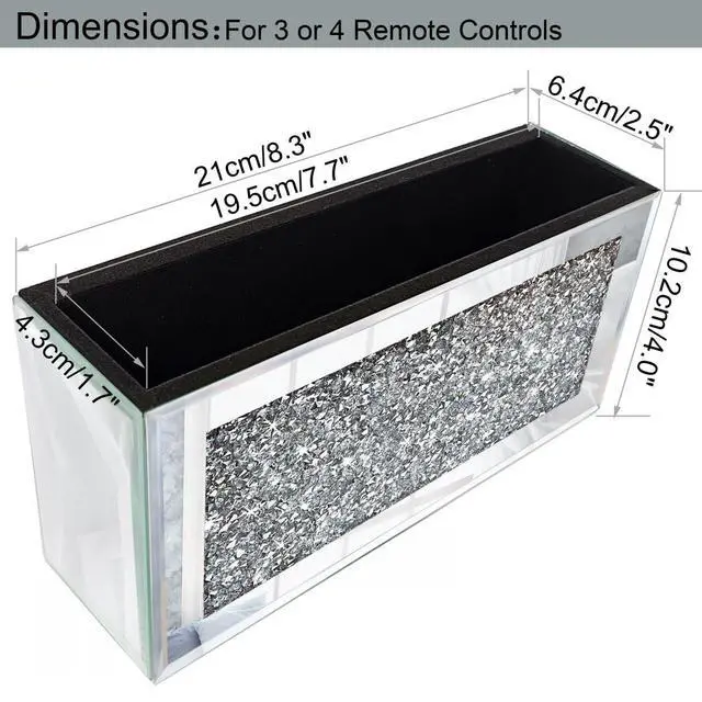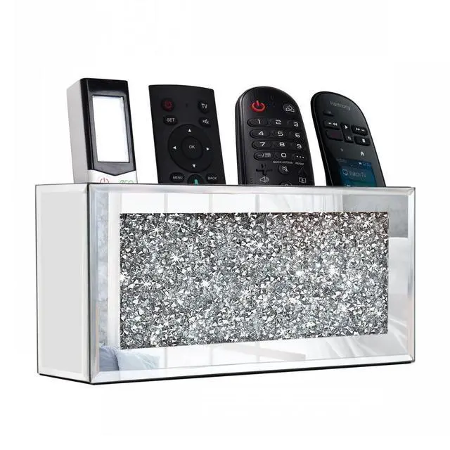 USEFUL & BEAUTIFUL: Mirrored remote control holder featuring a high-quality silver mirror with sparkling bling crush diamond, exquisite engraving, and bevel edging. Smooth, beautiful, and fashionable, it serves as luxurious wall decor while holding your items.