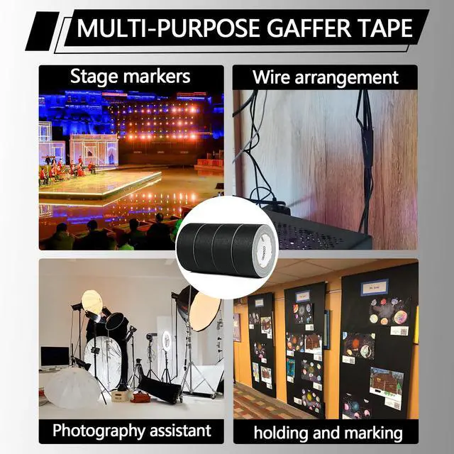 Multi Purpose Use Whether its concert, stage cables, set wires, boat repair, book binding, tucking or just for home use, this gaffer tape makes sure your gear and surfaces are safe and intact. With a soft matte black cloth on top that will make sure that your tape blends in on the used surface.