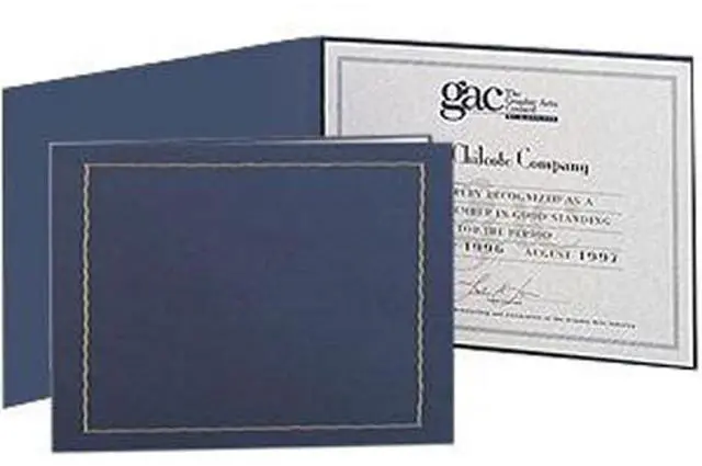 From award ceremonies to graduation events, the 11x 8.5" Certificate Folder Frame in a striking blue with gold foil accents is your go-to solution for presenting and preserving your important documents. This pack of 25 high-quality frames is not only cost-effective but also offers a professional and stylish way to showcase your achievements. Crafted from durable card stock, these elegant certificate frames are designed to hold one 8.5 x 11-inch photo or document securely. The rich blue color, complemented by the sophisticated gold foil border, adds a touch of class and professionalism to any certificate or diploma.