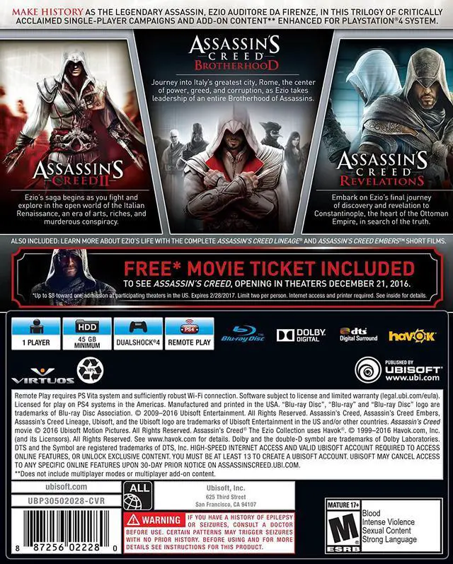 A legend is reborn and remastered for existing fans and newcomers alike! Live the complete saga of Master Assassin Ezio Auditore da Firenze, the most fabled leader of the Brotherhood of Assassins, as you seek vengeance for the betrayal of your family in a time of greed, corruption, and murderous conspiracy. Including three of the most critically-acclaimed titles in the storied Assassins Creed franchise, and featuring over 80 hours of gameplay remastered in stunning 1080p and at 30 fps, The Ezio Collection brings these enduring adventures to life like never before on next-gen consoles.