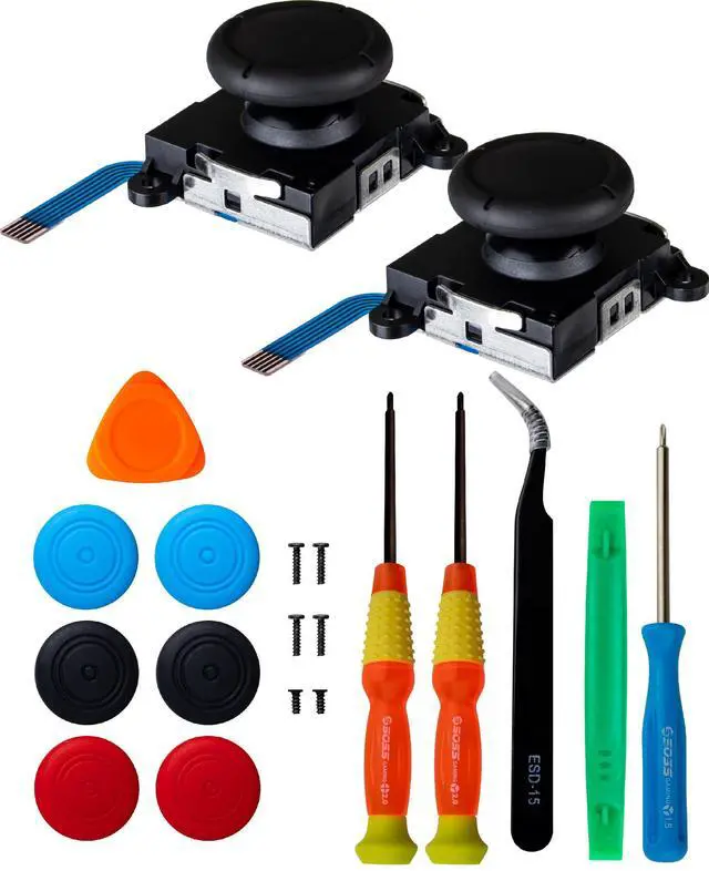 • PACKAGE INCLUDES: 2X Joysticks, 6X Thumbstick Caps, 6X Screws, 1.5Y Screwdriver, 2.0Y Screwdriver, 2.0+ Screwdriver, Tweezers, Double Pry Tool, and Pick Tool. Compatible with Nintendo Switch and Switch Lite Controllers.