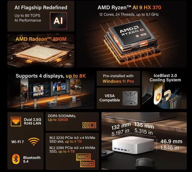 Blending next-gen AI processing, superior integrated graphics, and a compact yet robust design, the GEEKOM A9 Max redefines what a flagship mini PC can do. Powered by the AMD Ryzen AI 9 HX 370 processor and Radeon 890M graphics, this high-performance mini PC excels in AI computing, multitasking, and 1080p to 2K gaming. It's the ideal solution for power users, gamers, AI developers, and creative professionals looking for portable desktop-class performance.