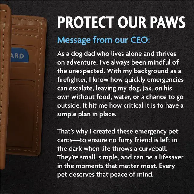 Ensure your pets are protected and cared for in emergencies with our Emergency Pet Information Cards. Featuring a durable, 30-mil PVC design and a writable matte surface, these cards are perfect for storing critical details about your pet's care and emergency contacts. The sleek and subtle design allows you to keep it in wallets, purses, or on your fridge without being obtrusive blending into daily life while standing out in times of need. Made in the USA, these cards are thoughtfully crafted to offer peace of mind, ensuring your furry friends receive proper care when youre not there.
