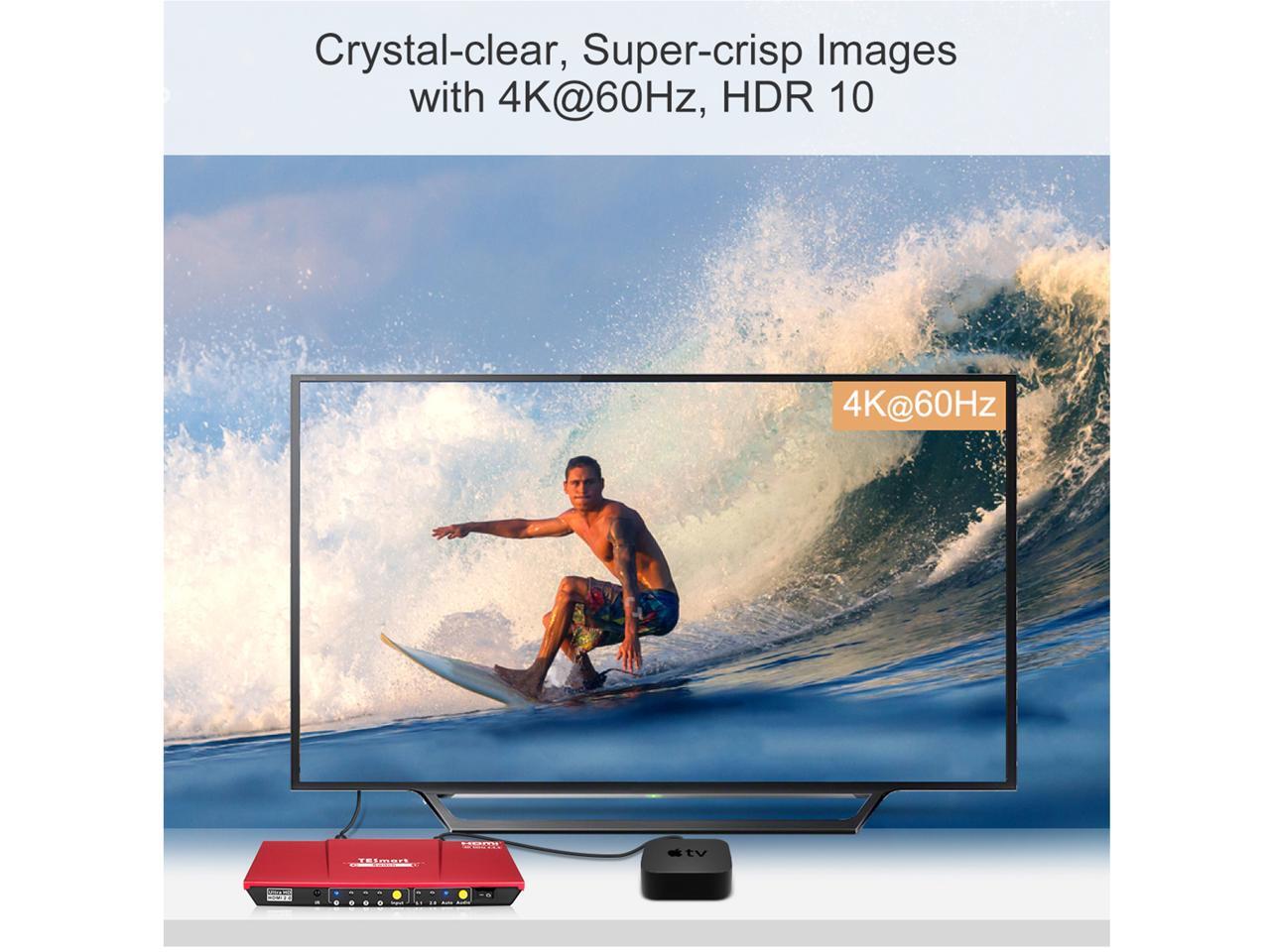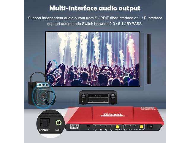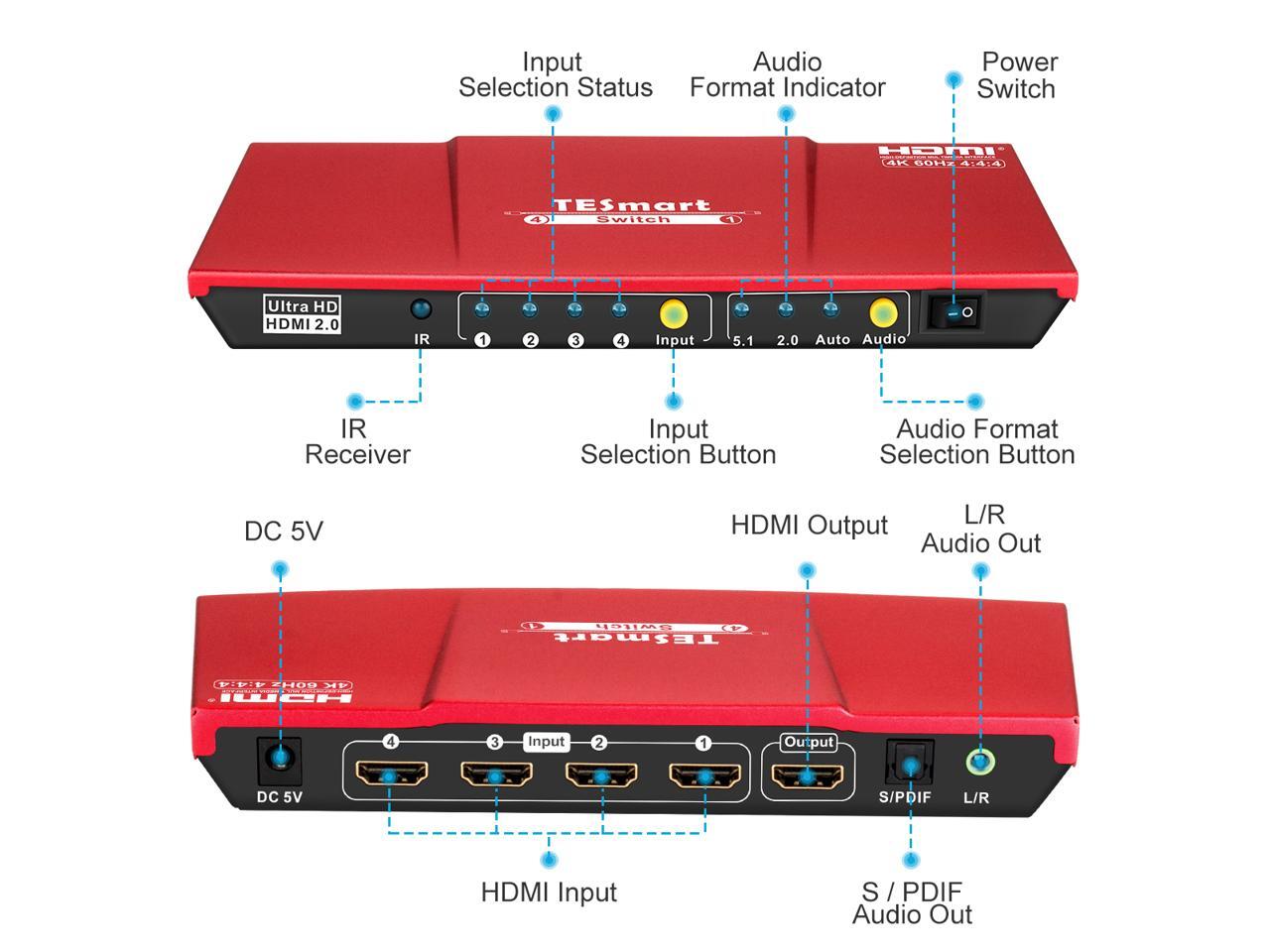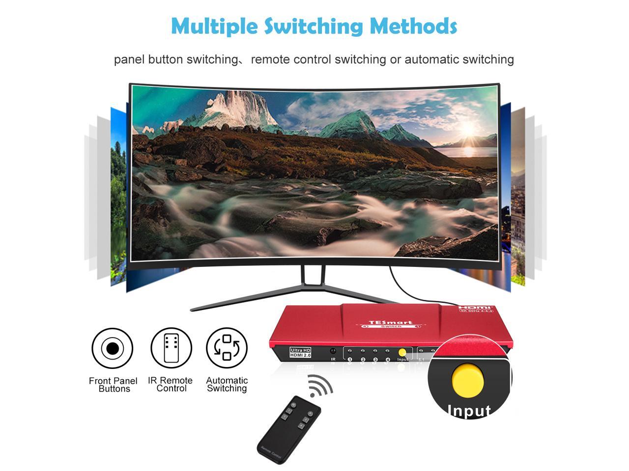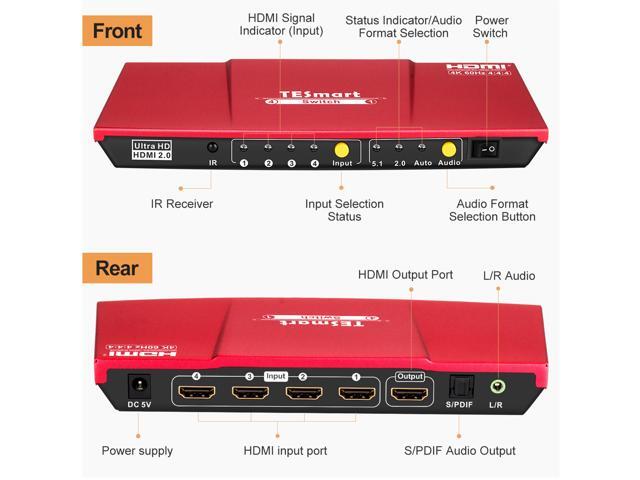 TESmart 4x1 HDMI Switch supports Ultra HD 4K@60Hz 4: 4: 4, 4-port HDMI switch with audio output and IR remote control, HDR, 3D, For Xbox 360/One, PS4/PS3