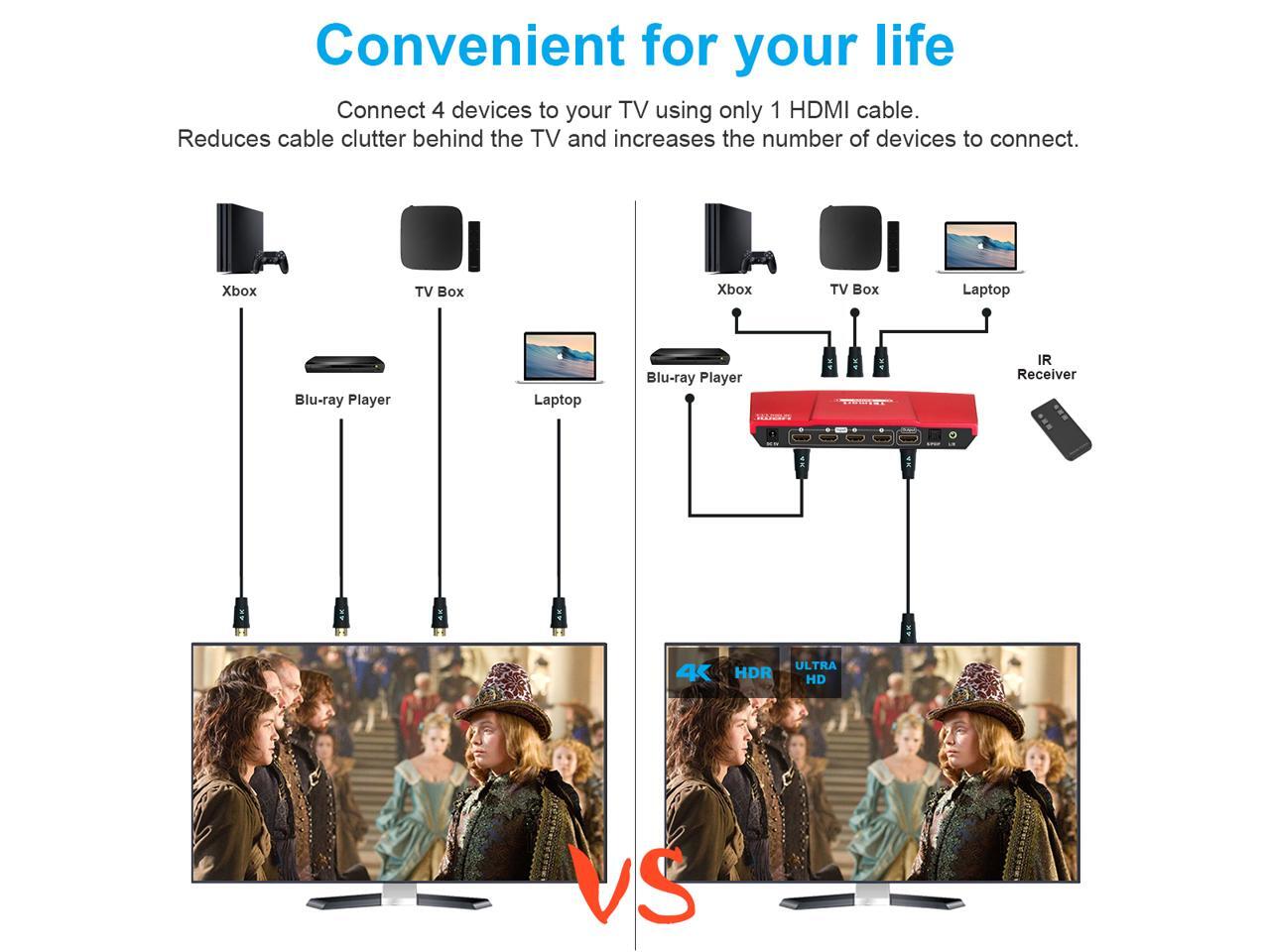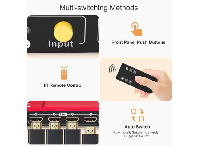 - ?4K ULTRA HD 4 IN 1 OUT?- This HDMI Switch connects up to 4 UHD HDMI sources on a single HD display and easily switch between 4 sources. Support bandwidth 18Gps, FullHD, UHD, DeepColor to 12bit.