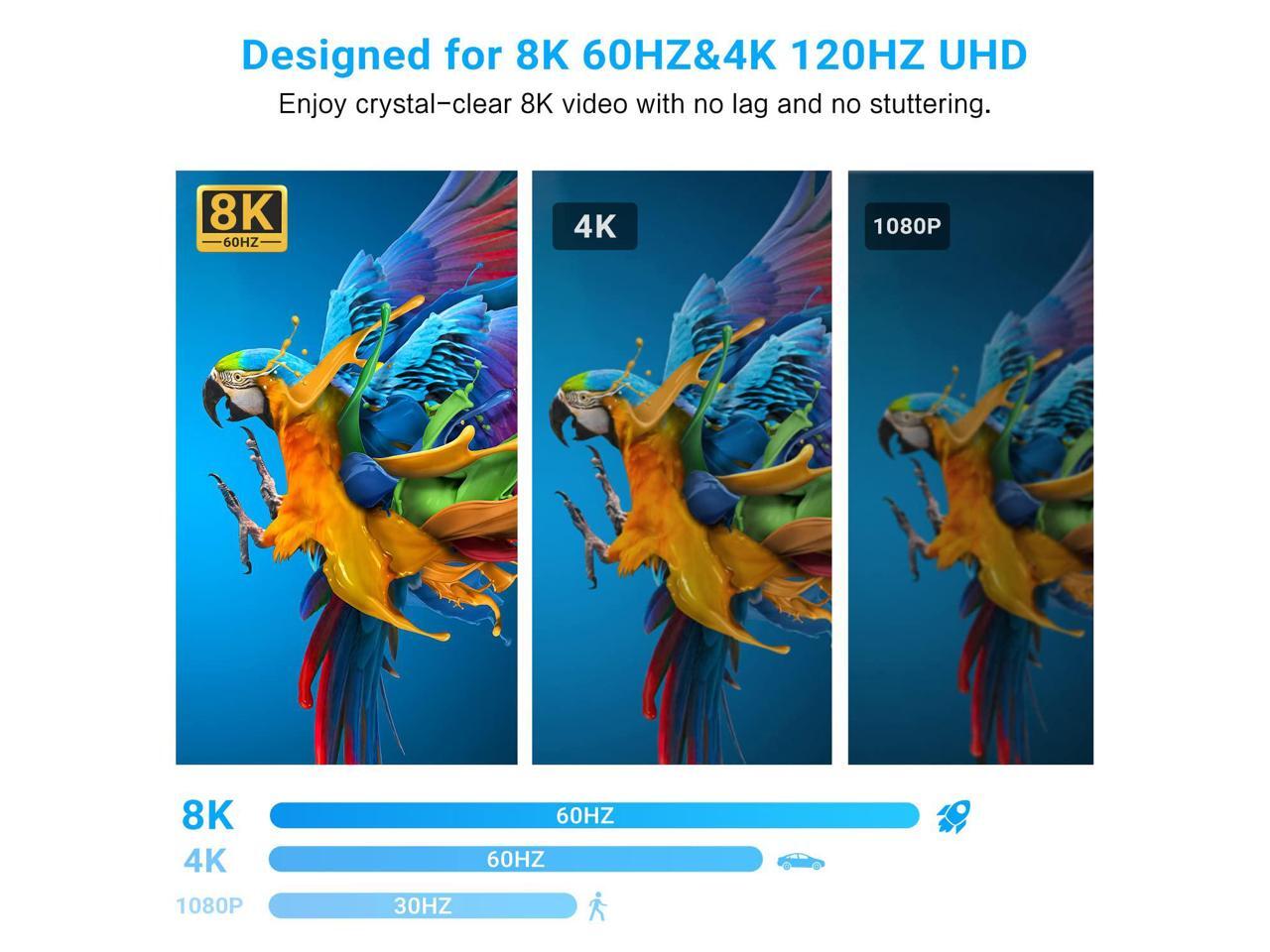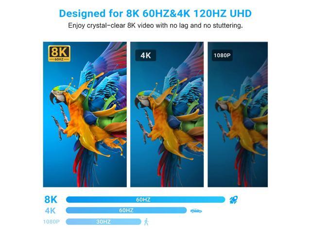 - High Resolution 8K 60hz: with the latest chip HDMI2.1 version,support 8K 60Hz,8K 30Hz,4K 120Hz,1080P 240Hz/144Hz, 720P,etc. High Speed transmission rate up to 48Gbps,support VRR,HDCP 2.3,HDR10,Do-l-by vision.