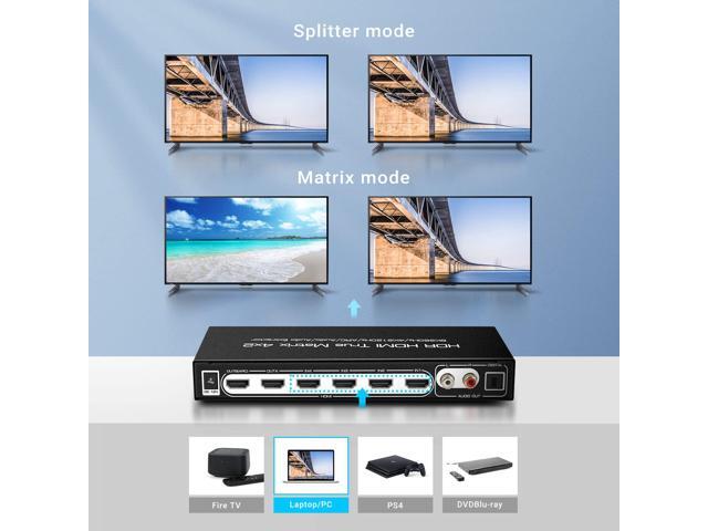 - 8K 4 IN 2 OUT Matrix: The HDMI Matrix allows 4 HDMI-devices to be switched or split easily to 2 HDMI-compatible monitors or projectors. Input support: Computer,Xbox,HD player,etc. Output support: Projector, HDTV etc. Can be widely used in home theater, office, school, conference room etc..