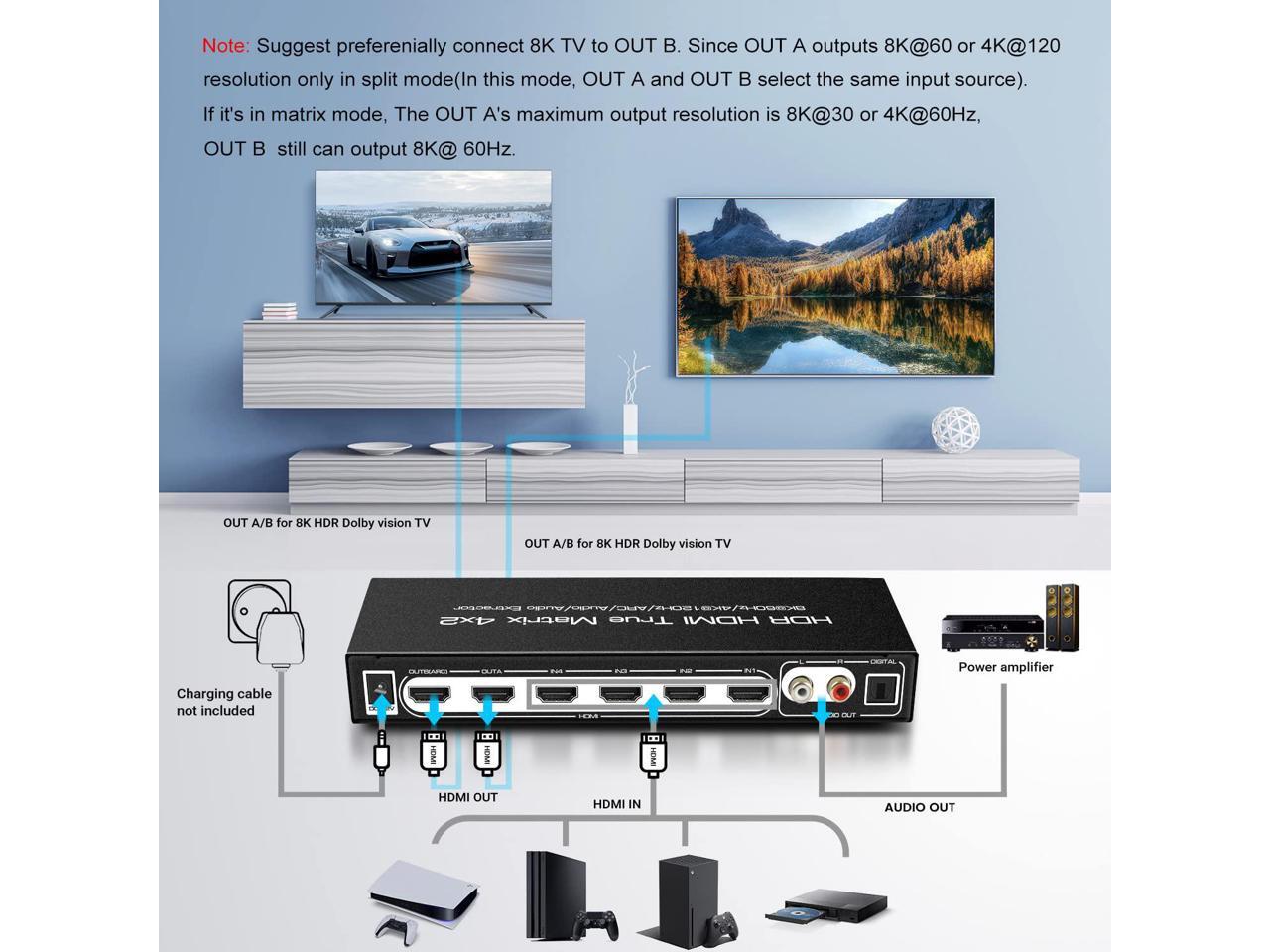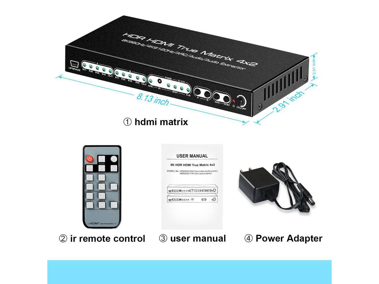 8K 4x2 HDMI Matrix, 4 in 2 Out HDMI 2.1 Matrix HDMI Video Switcher Splitter + Optical & L/R Audio Output,Support 4K @120Hz,HDR10 HDCP2.3 Do-l-by Vision Atmos SPDIF 5.1CH ARC with IR Remote Control