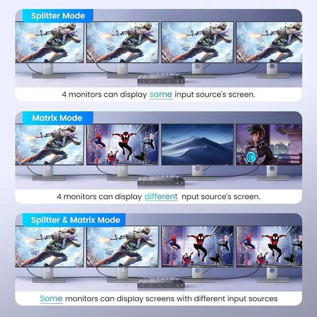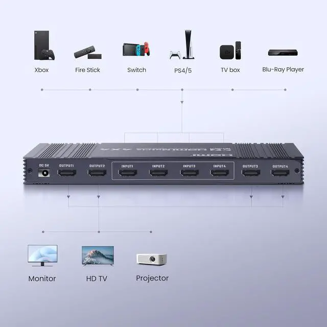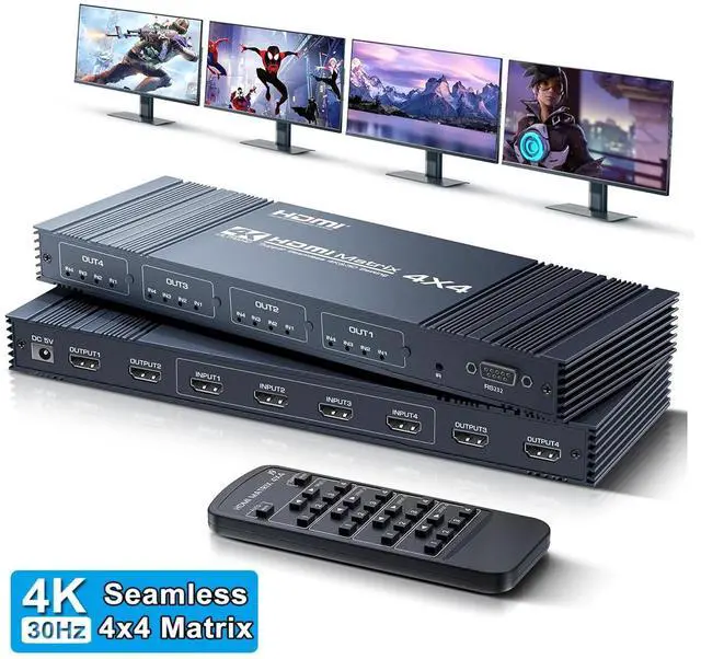 - 4X4 HDMI Matrix: This 4K hdmi switch transmits 4 hdmi input sources (such as gaming consoles, blu-ray players, streaming devices) to 4 displays at the same time, whether you need to display the same content on all screens or provide a unique signal for each output, this 4x4 hdmi matrix has it all.