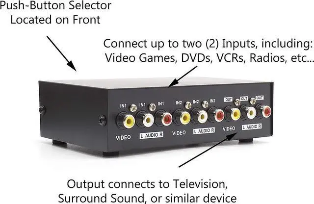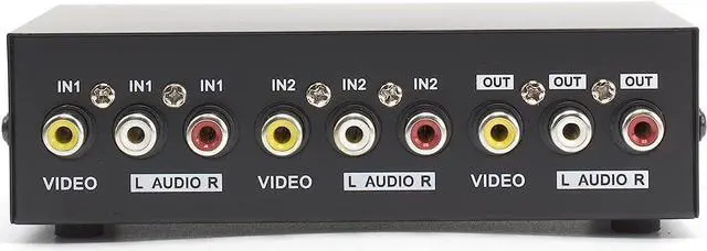 2IN-1-OUT - 2 Input 1 Output audio and video selector box switches between AV sources with button on front panel, without distortion or time loss - Connects 2 video devices to 1 TV set