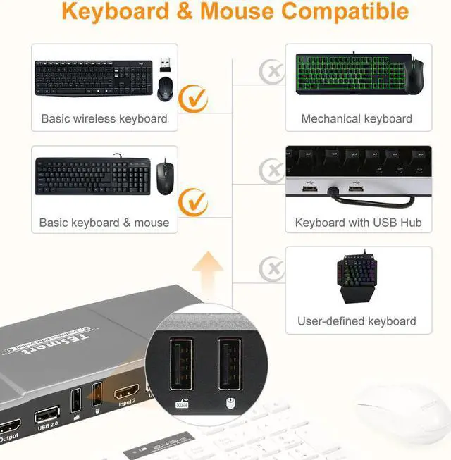 2x1 SWITCH Hot Key Switch SupportedYou can switch input source via your keyboard, much convenient and fasthot key: Scroll Lock + Scroll Lock+ numberand so on. It could not support hot key switching when connected to USB 2.0 port