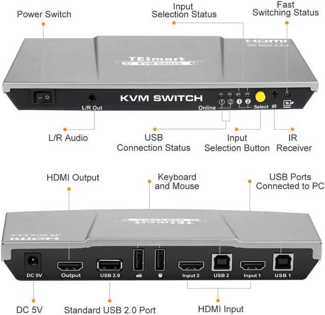 TE 4K@60Hz Ultra HD 2x1 KVM Switch 3840x2160@60Hz 4:4:4 with 2 Pcs 5ft KVM Cables Supports USB 2.0 Devices Control up to 2 Computers/Servers/DVR(Black)