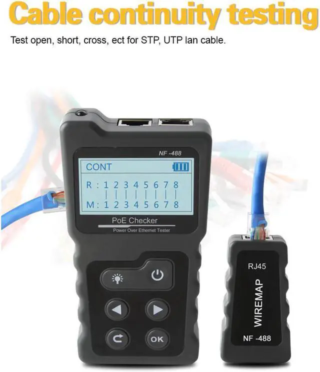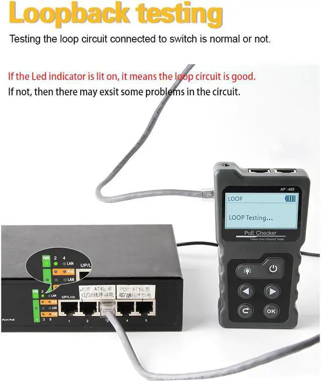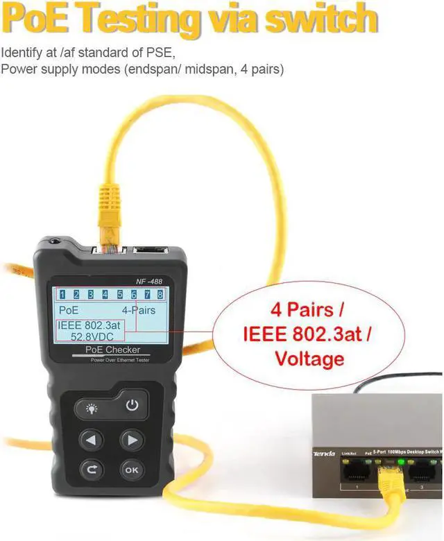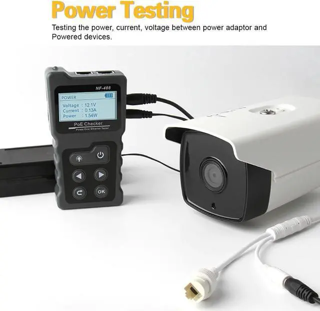 The PoE checker is consists of two parts: an Emitter and a remote. It has functions such as standard and non-standard PoE equipment detection, PoE power online test, network cable continuity test, DC power test, switch loop-back test and other functions. Therefore, it is a perfect for security monitoring, communication wires, integrated wiring and other weak current systems.