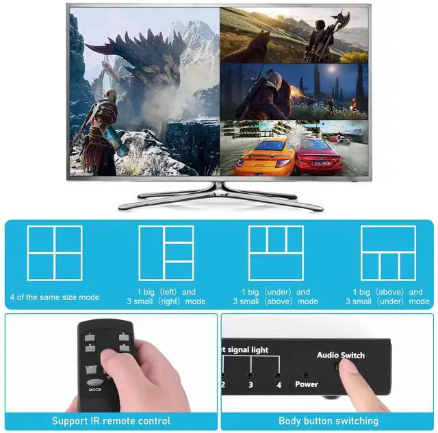 HDMI Multiviewer Switch 4x1,It help you display one content or four screens at the same time.Can be used in,work meetings,and game consoles